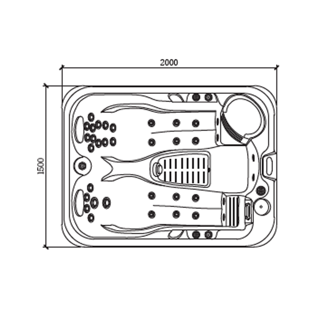 Avec des dimensions de 2000 × 1500 × 770 mm, ce spa offre un espace suffisant sans être encombrant, ce qui le rend idéal même pour les espaces de vie plus restreints ou les grandes salles de bain.
